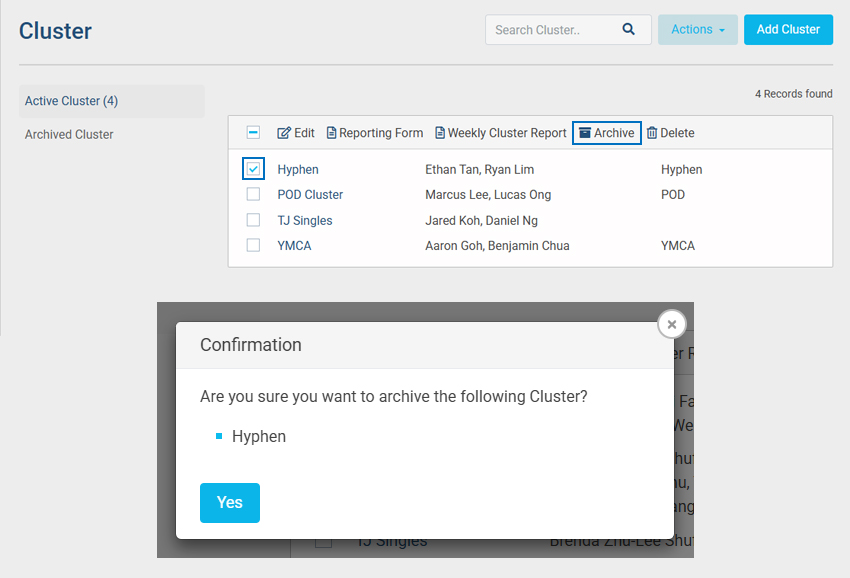 - A confirmation modal will open to confirm that you are ready to archive the cluster. Click Yes to successfully archive the cluster.
