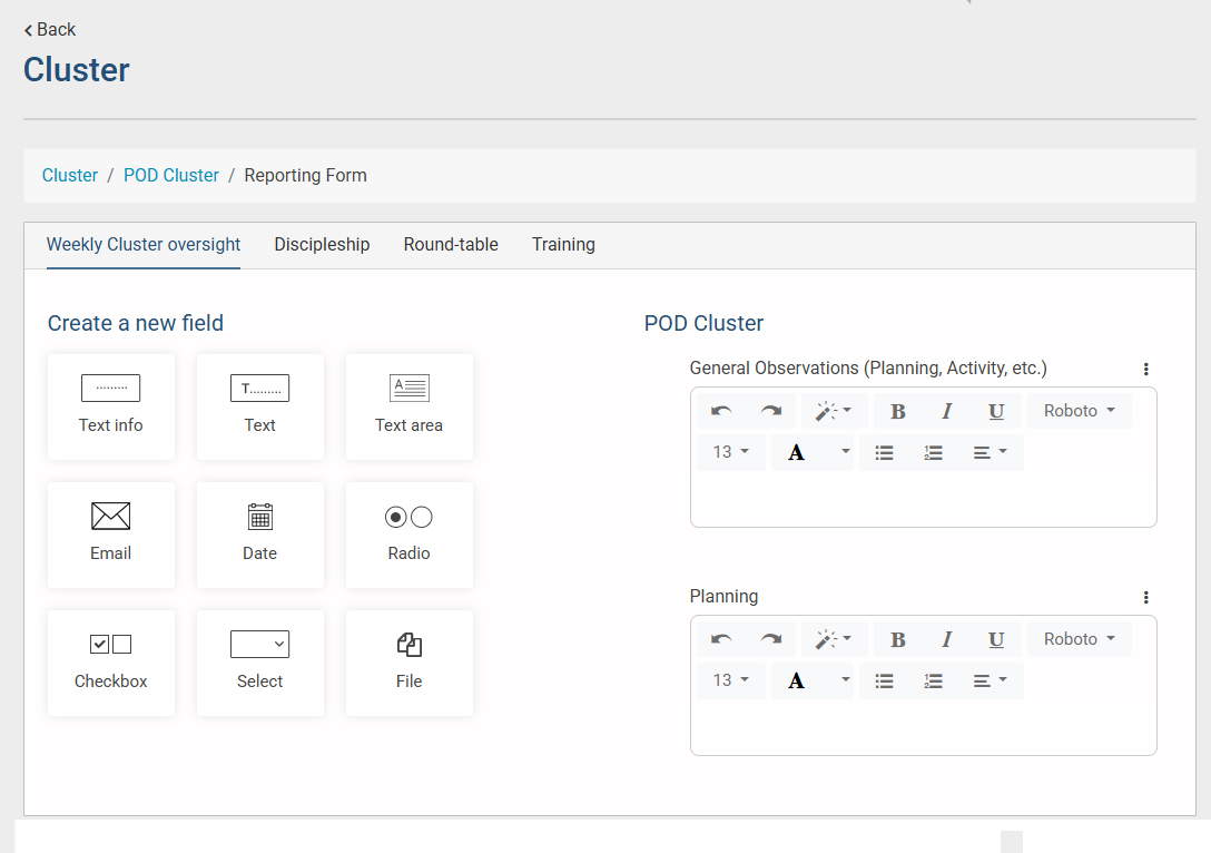 - A new module will open where you can edit the reporting form for this cluster. This module is related to the Form Builder module. Here is the reference: Reporting Form Modifications ->