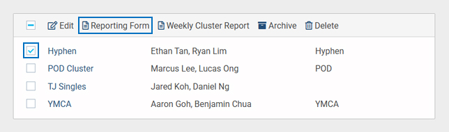 - Select the checkbox next to the cluster name. After selecting it, multiple options will appear in the action bar. Click on the Reporting Form button.