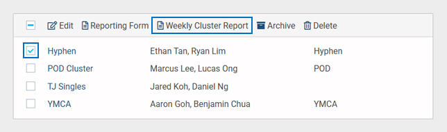 - Select the checkbox next to the cluster name. After selecting it, multiple options will appear in the action bar. Click on the Weekly Cluster Report button.