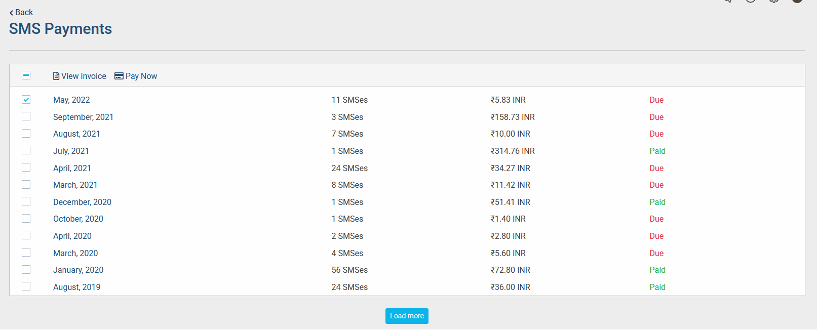 - You can manage SMS billings from the Actions drop-down button Payments option. This page lists all paid and due invoices in monthly basis. You can download invoice and make payment for any due invoices.