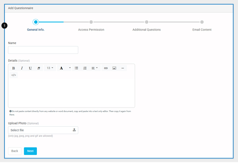 Do not paste content directly from a website or Word document. Paste it first into a text editor, then copy it here. - Upload Photo (Optional): Upload an image related to the questionnaire.