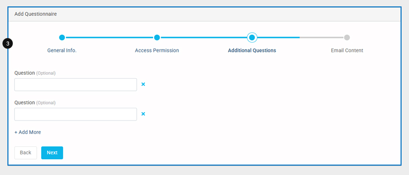 - Question (Optional): Enter a question. Click + Add More to add additional questions.Use the remove (×) icon to delete a question if needed.