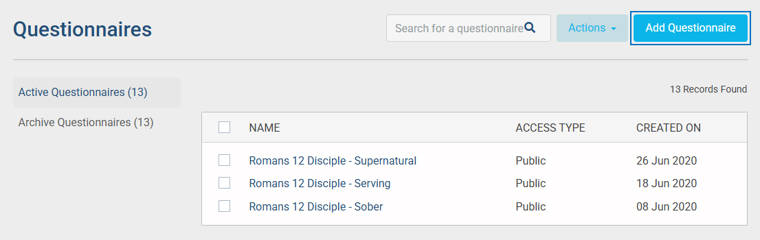• Click on Add Questionnaire to create a new Questionnaire.