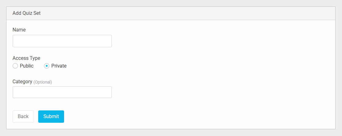 - Private – Only specific categories can access the quiz set.