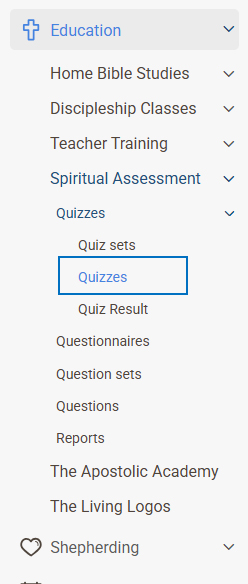 • Go to the Education tab on the left panel. open Spiritual Assessment, From there navigate to the Quizzes section and click on Quizzes.