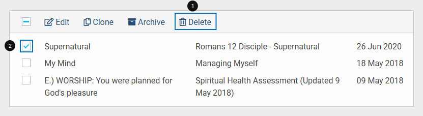• Select the checkbox next to the question set. An option called “Delete” will appear in the top bar. Click on the option.