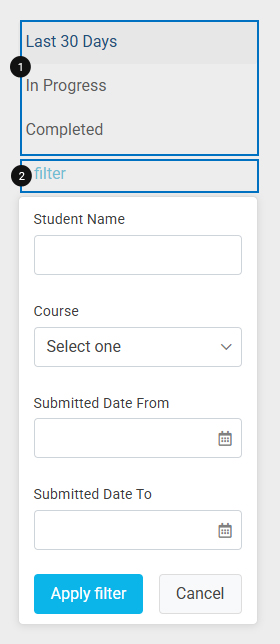 The Custom Filter allows you to filter data by student name, course, and submitted date range (From and To). You can use this filter to narrow down specific data.