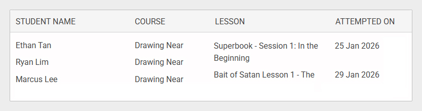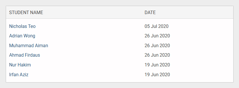 3. The Completed section shows all students who have completed their courses, along with the completion date.