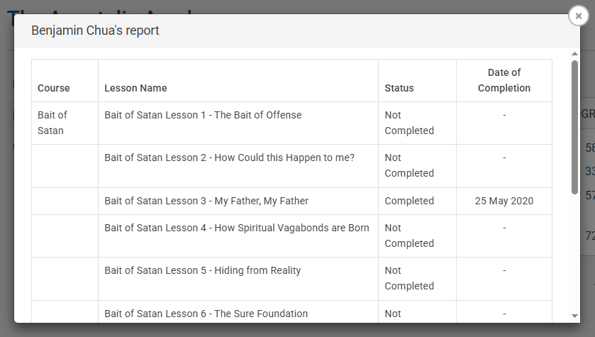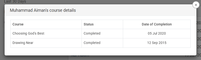 • Additionally, you can click on the user’s name to see which courses they have completed, along with the completion dates.