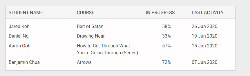 2.The In Progress section shows students who are currently enrolled in courses. It also displays their progress percentage, indicating how much of the course they have completed.