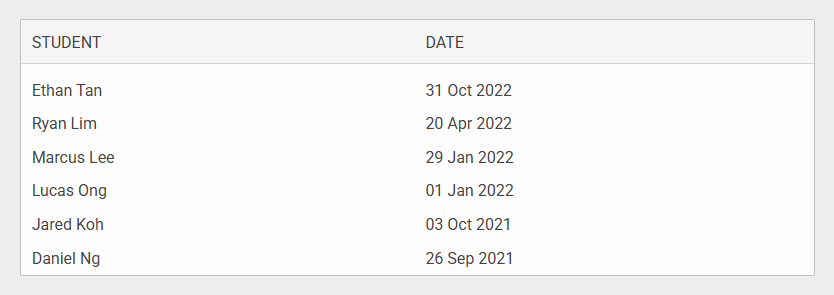 1. The Last 30 Days section displays students’ activity over the past 30 days in their Quizzes. It also shows the last attempted date and the total attempts on the lesson.
