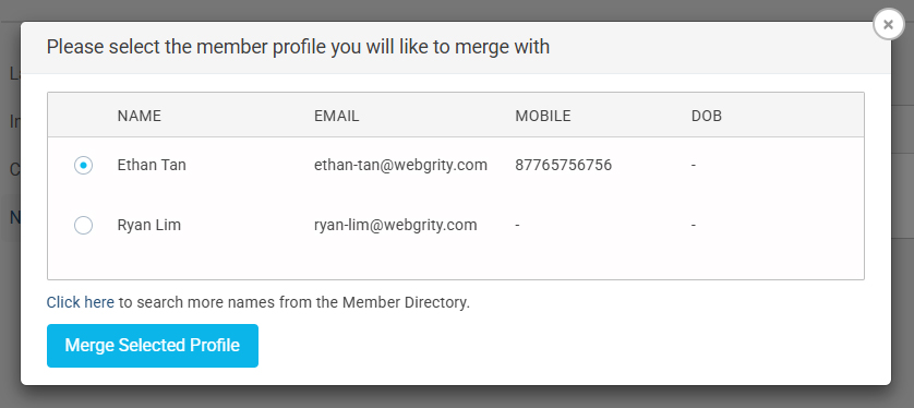 When you click Merge, a popup window opens displaying a list of matching member profiles, including details such as name, email, mobile number, and date of birth. Select the profile you want to merge with, then click Merge Selected Profile. The selected profiles are merged into a single member profile.