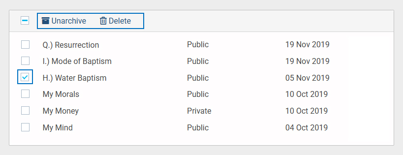 - In Archive Questionnaires, select the checkbox next to the questionnaire name to reveal the action options in the top bar. From there, choose the action you want to perform, such as Unarchive or Delete.