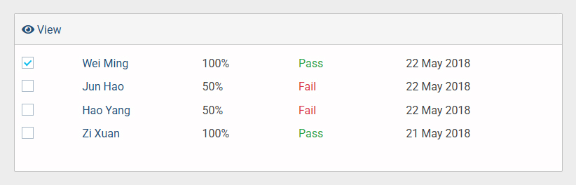- In the Results section, select the checkbox next to a user’s name to display the available view option in the top bar.