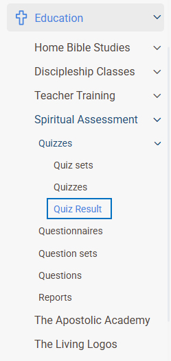 - Go to the Education tab on the left panel. open Spiritual Assessment, From there navigate to the Quizzes section and click on Quiz Result.