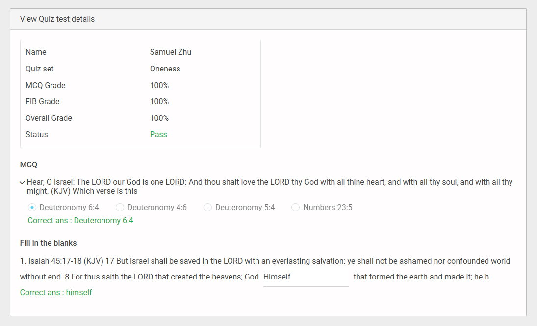 - This is the detailed results page that appears after clicking the View option, showing the user’s quiz information, grades, answers, and correct responses.