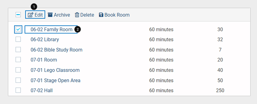 - Select the checkbox for the room you want to edit, then click Edit from the top bar.