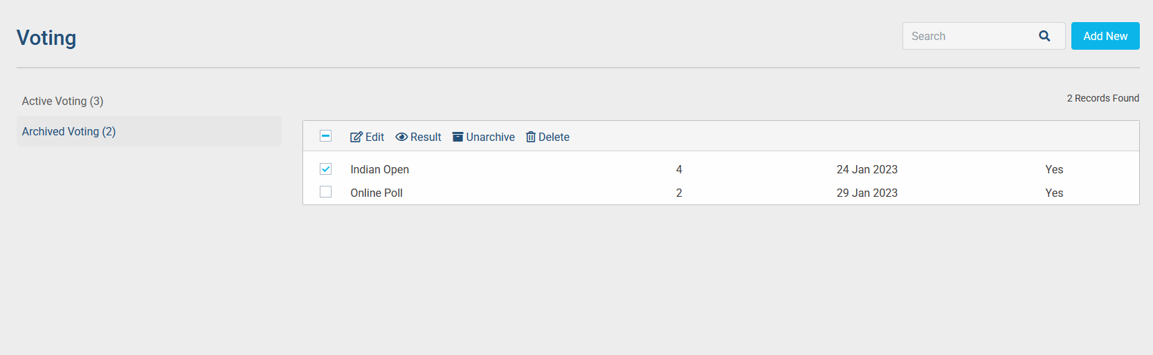 Check the checkbox next to the voting title to make changes. Use the options in the top bar to select the action you want to perform.